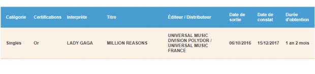 Através de seu site, a Snep Musique oficializou hoje (05), que o segundo single do álbum Joanne, Million Reasons, recebeu o certificado de ouro na França, por mais de 75 mil cópias vendidas.