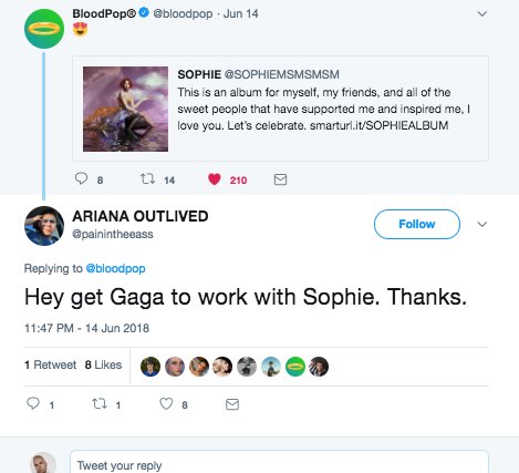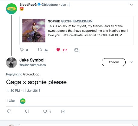 Primeiro, o produtor curtiu alguns tweets de fãs pedindo para que ele fizesse uma colaboração entre Gaga e SOPHIE acontecer.