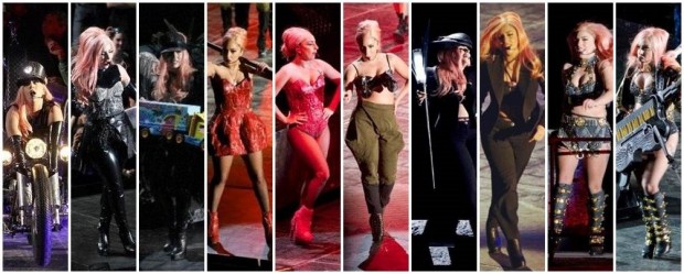 Gaga alternou suas perucas em diversas partes do show, variando entre loira com mechas escuras, loira acinzentada, laranja, mechas arco-íris, loira clara, azul, rosa e verde neon.