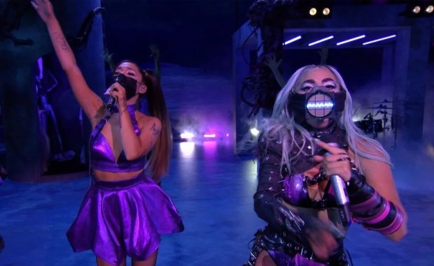 Lady Gaga e Ariana Grande fazendo as máscaras serem legais no MTV Video Music Awards de 2020, realizado virtualmente em meio à pandemia do coronavírus. Photo: MTV/AFP