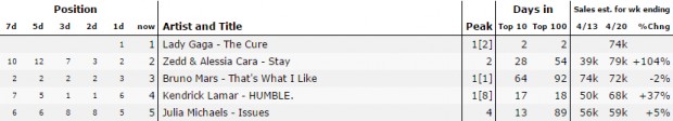 Confirmando o excelente desempenho da nova música de Lady Gaga, "The Cure", o Kworb divulgou hoje a estimativa de vendas digitais para o lançamento esta semana.