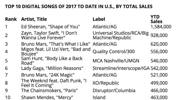 Million Reasons, segundo single do álbum Joanne, aparece em listagem com o Top 10 de canções mais vendidas até 30 de março de 2017.