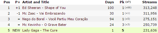 Refletindo a grande quantidade de fãs e admiradores que Lady Gaga possui em terras brasileiras, seu novo single, "The Cure", lançado em sua primeira apresentação no palco do Festival Coachella na madrugada de domingo, estreou em alta no Spotify Brasileiro.