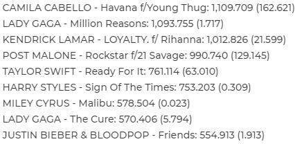 Na lista, "Million Reasons" aparece com 1 bilhão e 93 milhões em audiência acumulada, enquanto "The Cure" aparece com 570 milhões. Confira: