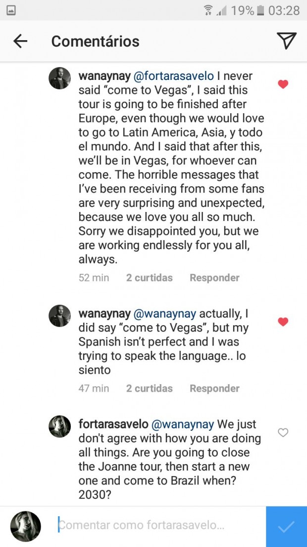 "Eu nunca disse 'venham para Vegas', eu disse que essa turnê terminará depois da Europa, apesar de que adoraríamos ir para a América Latina, Ásia e o resto do mundo. Eu disse que depois disso estaremos em Vegas, para quem quiser vir. As mensagens horríveis que eu estou recebendo de alguns fãs têm sido surpreendentes e inesperadas, pois nós amamos muito vocês. Sinto muito por desapontar vocês, mas nós estamos trabalhando infinitamente para todos vocês, sempre.