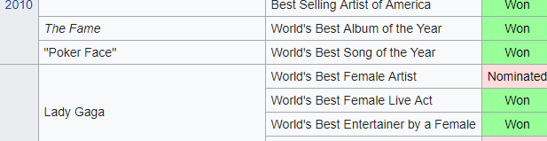 Em 2014, Gaga ganhou outros 4 prêmios na premiação, "World's Best Female Live Act", "World's Best Entertainer by a Female", "World's Best Album by a Female" por "ARTPOP" e "World's Best Song by a Female" com "Applause".