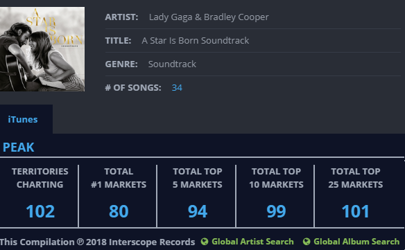 O filme "Nasce Uma Estrela" ainda não foi lançado em vários países, mas quando se trata do álbum do filme, além de lançado, ele ocupou o topo do iTunes em um número impressionante de territórios.