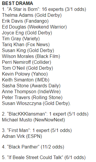Dezesseis dos nossos 18 especialistas do Globo de Ouro dos principais meios de comunicação estão prevendo que o líder na corrida do Oscar, "Nasce Uma Estrela", ganhará o prêmio de Melhor Drama nesses prêmios precursores. Um especialista está apoiando "Infiltrado na Klan", enquanto outro favorece "O Primeiro Homem".