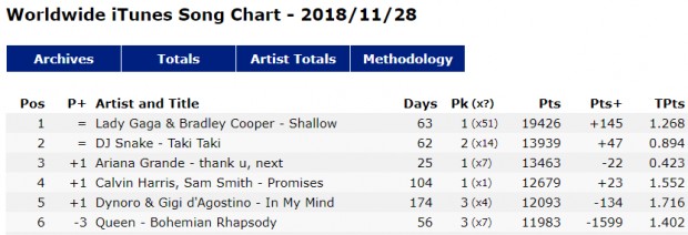 Na atualização desta quarta-feira (28) do chart, o primeiro single da trilha sonora de "Nasce Uma Estrela", "Shallow", completou 51 dias em primeiro lugar, tomando o título para si.