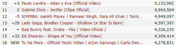 Hoje, segundo o Kworb, o vídeo alcançou 4 milhões e 600 mil visualizações em 24 horas, retornando também ao Top 15 dos mais visualizados do dia.