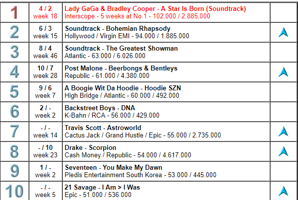 A trilha sonora de "Nasce Uma Estrela", que se manteve por 5 semanas não consecutivas em #1, agora completa 6 semanas no topo, com 102 mil cópias comercializadas.
