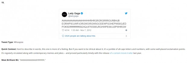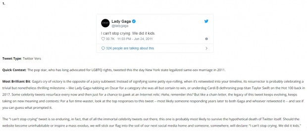 Ocupando o 1º lugar da lista, está um tweet de 2011, no qual Lady Gaga publicou sobre a legalização do Casamento Gay em Nova Iorque, comemorando e compartilhando a notícia com seus fãs.