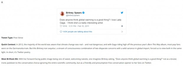 Contexto rápido: Em 2012, a maioria do mundo estava consciente que a mudança climática era real - e muito perigosa, e com Gaga saindo de seu vôo alto do ano anterior com o álbum 'Born This Way', muitos fãs pop estavam no trem da Germanotta. Mas essa falácia de Britney, uma transmissão de combinação consciente de duas preocupações discrepantes com uma variação selvagem de importância global, nos forçou a ver ambos sob a mesma luz. Abreviando, é uma poesia do Twitter.