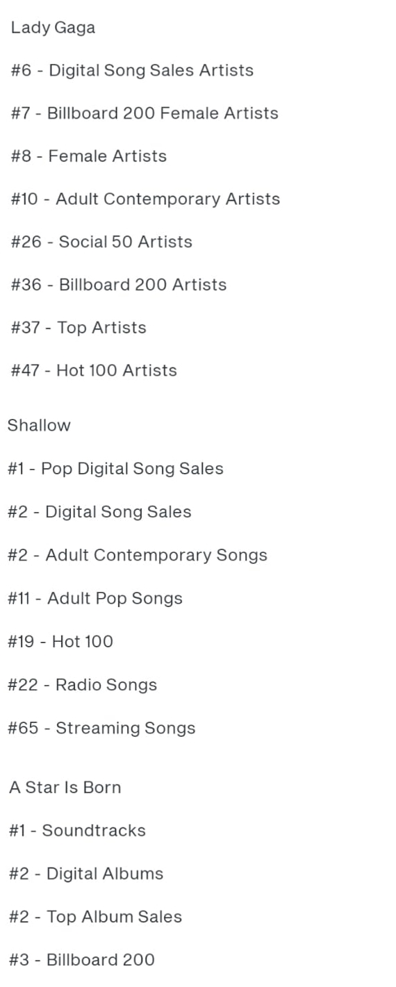 Figurando em 19 categorias diferentes - "Shallow" (7), "Nasce Uma Estrela" (4) e Lady Gaga (8) - ambas aparecem em grande destaque nos gráficos, estando no Top 50 (somente uma categoria de "Shallow" ficou abaixo).