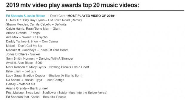 Baseado em reproduções cumulativas de vídeos musicais de 1 de janeiro a 4 de dezembro de 2019, a MTV divulgou sua lista dos destaques do MTV Video Play Awards de 2019, estando uma das canções de Lady Gaga entre eles.