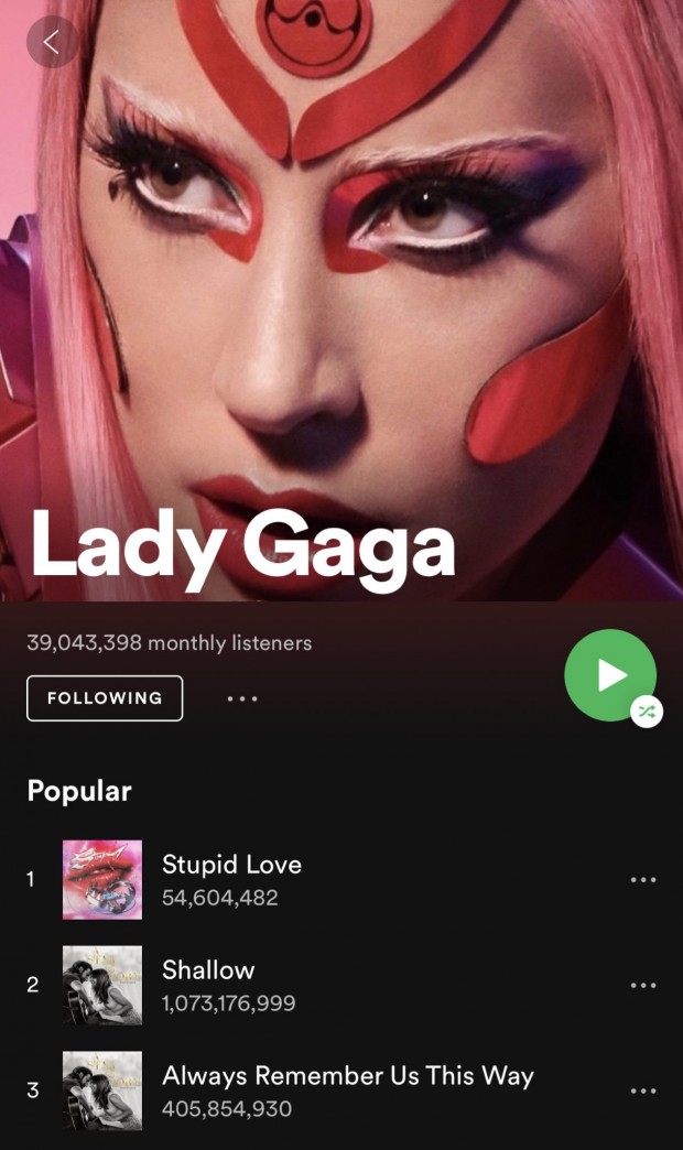 Grande parte desse número é graças ao lançamento de "Stupid Love", que marca presença nas maiores playlists do Spotify e atrai um novo público para Lady Gaga.