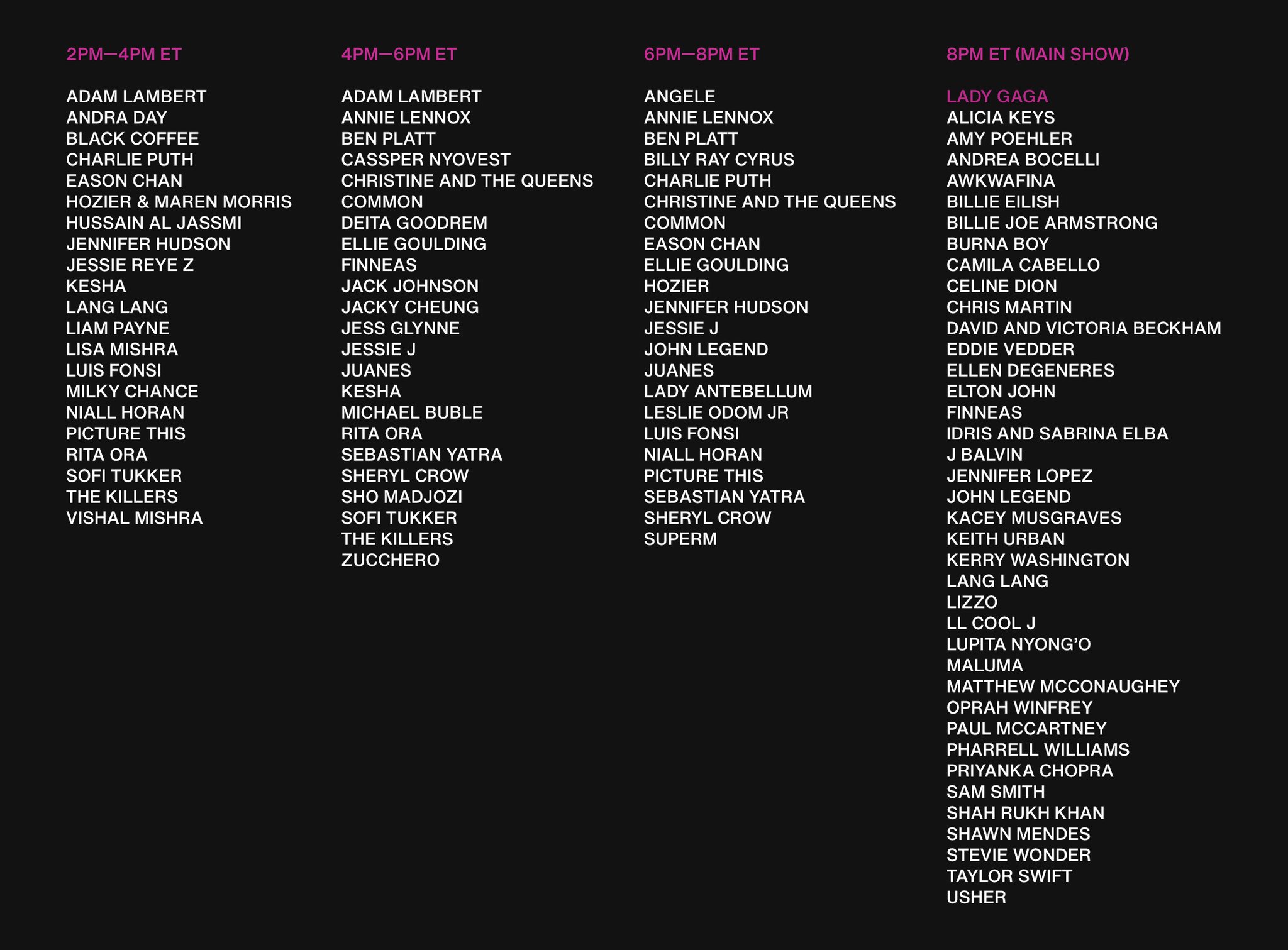 Artistas convidados - show principal: Alicia Keys, Amy Poehler, Andrea Bocelli, Awkwafina, Billie Eilish, Billie Joe Armstrong (Green Day), Burna Boy, Camila Cabello, Celine Dion, Chris Martin, David & Victoria Beckham, Eddie Vedder (Pearl Jam), Ellen DeGeneres, Elton John, FINNEAS, Idris and Sabrina Elba, J Balvin, Jennifer Lopez, John Legend, Kacey Musgraves, Keith Urban, Kerry Washington, Lady Gaga, Lang Lang, Lizzo, LL COOL J, Lupita Nyong’o, Maluma, Matthew McConaughey, Oprah Winfrey, Paul McCartney, Pharrell Williams, Priyanka Chopra Jonas, Sam Smith, Shah Rukh Khan, Shawn Mendes, Stevie Wonder, Taylor Swift e Usher.
