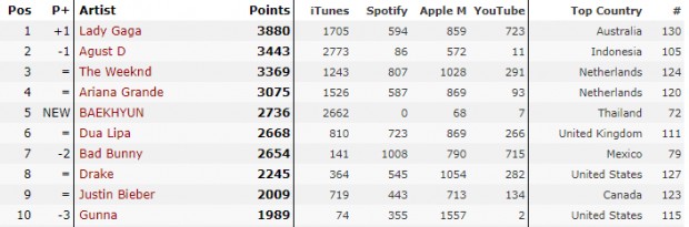 Com quase 4 mil pontos, Gaga ultrapassou Agust D e alcançou o #1 na tabela.