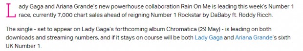 Segundo a Official Charts, "Rain On Me" está saindo na frente na corrida com uma vantagem de 7 mil cópias em relação a "Rockstar", de DaBaby ft. Roddy Ricch.