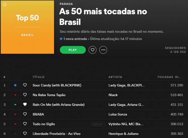 Após Lady Gaga e Ariana Grande quebrarem o recorde de melhor estreia internacional do Spotify Brasil com "Rain On Me", que recebeu mais de 800 mil reproduções nas primeiras 24 horas, chegou a vez de outra música do álbum "Chromatica" deixar a sua marca.