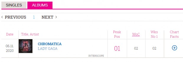 Em uma disputa acirrada com o segundo colocado, que promoveu o seu novo álbum incansavelmente na última semana, Lady Gaga conseguiu manter o #1 no chart de álbuns do Reino Unido com o "Chromatica".