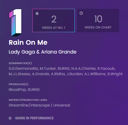 Como publicamos na semana passada, a parceria entre Lady Gaga e Ariana Grande, "Rain On Me", havia alcançado o topo das rádios canadenses, segundo o chart da Billboard para o formato.