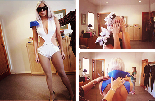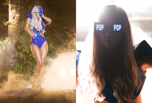 Lady Gaga usa macacão, máscara e óculos da Haus Of Gaga, botas da Givenchy e luvas da Ines. Durante a cena seguinte, Gaga usa botas de Betsey Johnson.