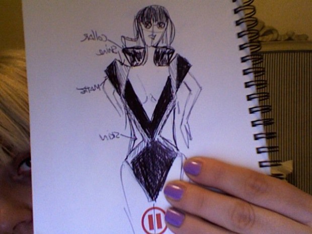 Lady Gaga usa um vestido de manga justa metálico de Antonio Berardi, uma ombreira de acrílico de Mike Feeney, leggings de patchwork de renda angulares de Brian Lichtenberg, botas da Givenchy, um colar Bri-Angle de Alex & Chloe (Brian Lichtenberg) e um anel de Swarovski.