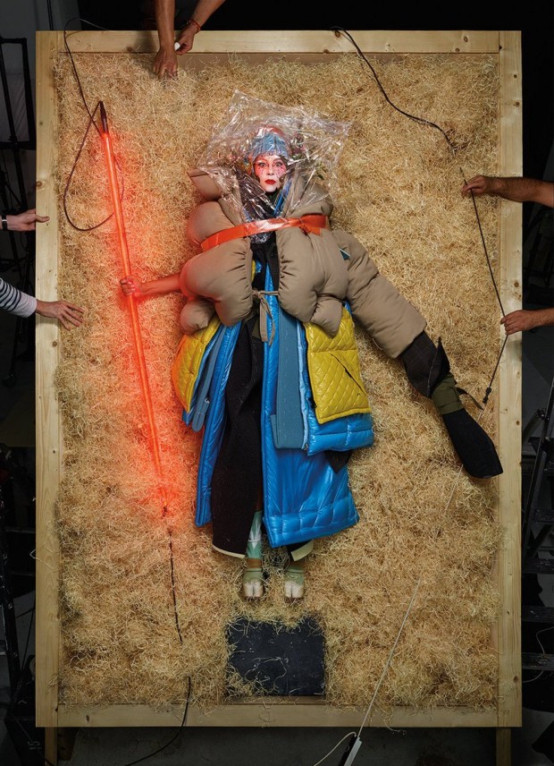 Depois que Lady Gaga lançou seu álbum "Joanne", ela começou a gravar o famoso filme "Nasce Uma Estrela" ao lado do diretor e co-protagonista Bradley Cooper e dominou o mundo, de novo. Depois de vencer um Oscar pelo mega-hit "Shallow" com a participação de Cooper e o sucesso do filme, Gaga foi capa da V Magazine novamente. Ela sempre foi muito além dos limites que qualquer um espera dela e essa capa não é uma exceção. Intitulada "Ela é um Enigma!" Gaga usou um vestido clássico preto elegante, um casaco rosa enorme cheio de penas pretas, seu rosto pintado de branco com um cocar de penas enquanto ela segura dois bastões de neon e morde em um deles, tudo em uma pilha de feno. Outra foto mostra apenas seus olhos em uma pilha de feno enquanto ela segura bastões de neon no formato de "V". Outras fotos mostram Gaga em casacos gigantes com um laço ao seu redor e um chapéu de plástico e outra com Gaga segurando um dos bastões de luz como uma espada enquanto duas pessoas, uma em cima do ombro da outra, trabalham em seu enorme cabelo à la Maria Antonietta.