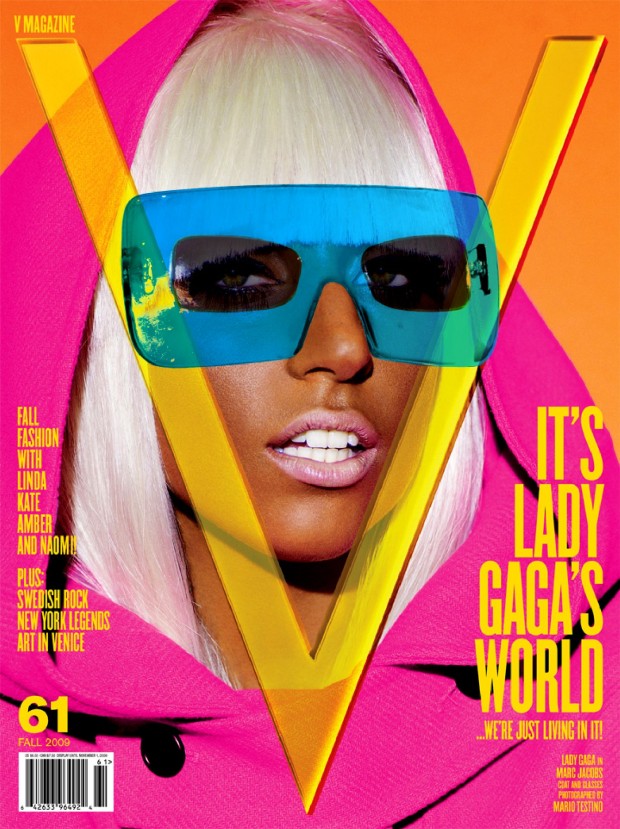 A carreira de Lady Gaga começou a avançar em 2008, e em 2009, ela estava dominando o mundo e, claro, estampou a capa da V Magazine. Com um bronzeado extremamente escuro, reminiscente do final de 2000, Gaga usou seu loiro platinado característico com uma franja grande, um óculos escuro azul gigante e um capuz rosa enquanto seu rosto se encaixa perfeitamente em um enorme "V", por razões sugestivas ou porque ela estava conquistando a indústria da música. Vestida por Nicola Formichetti e fotografada por Sebastian Faena, Gaga usou um vestido azul e saltos na praia, looks bondage, peça na cabeça que parecia o sistema solar e mais um pouco daquele bronzeado icônico, mostrando as escolhas de moda que a separaram de praticamente qualquer outra pessoa.