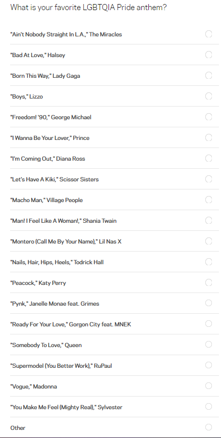 Dentre os ícones LGBTQIA+ estão a drag queen RuPaul, o rapper Lil Nas X e a cantora Madonna. A nossa Mother Monster foi uma das escolhidas com a canção "Born This Way".