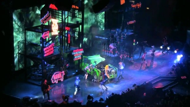Um grande telão transparente era posto na frente do palco, enquanto no mini palco (que era também um grande elevador que alcançava mais de 5 metros de altura), dois telões em um formato 360 graus desciam em uma parte do show para exibir a "Twister Interlude".