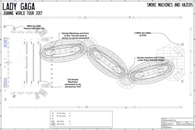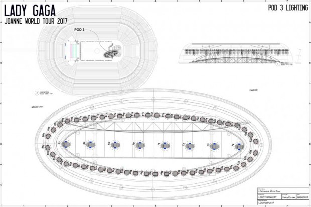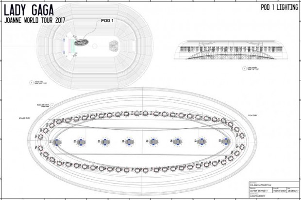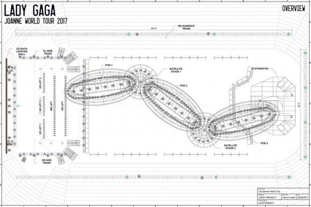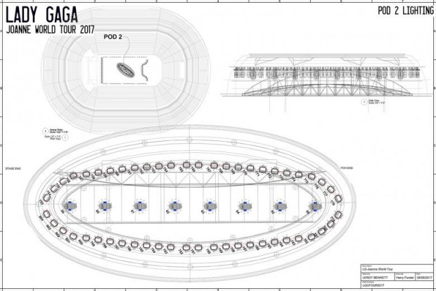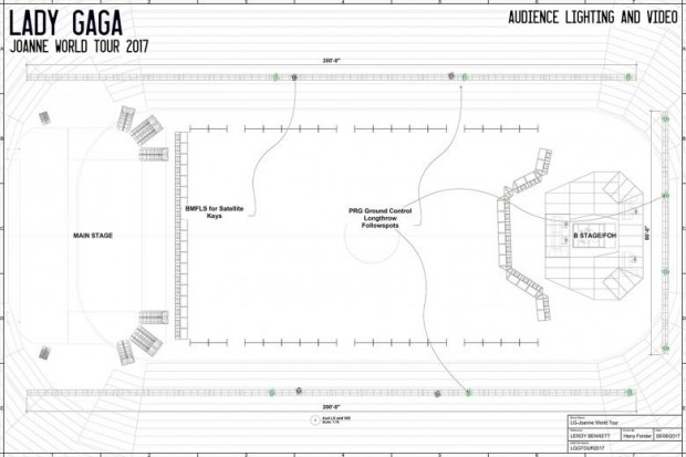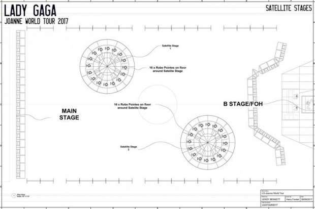 Além das plataformas, foram projetados três painéis de iluminação infláveis que ficavam suspensos acima da plateia e sustentavam 3 passarelas que se transformavam em telões de projeção, semelhantes a outdoors. Cada uma dessas 3 passarelas ligavam o palco principal aos "Satellites Stages" e ao “Palco B” onde ficava o piano no qual Gaga se apresentava no bloco de canções acústicas.