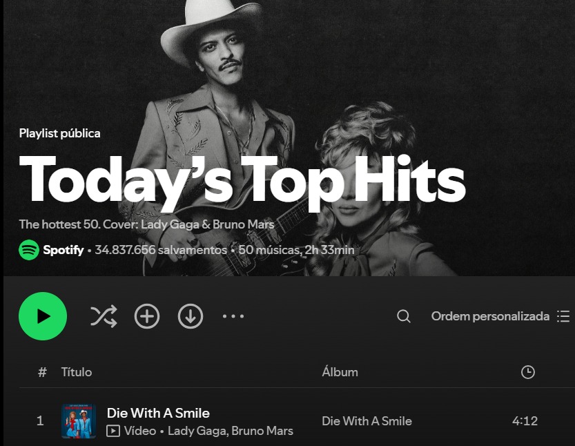 Lady Gaga e Bruno Mars são os novos queridinhos da playlist mais popular do Spotify, a Today’s Top Hits. Com o single "Die With A Smile", os dois artistas não só conquistaram a capa da playlist como também alcançaram o topo da parada, deixando fãs e críticos animados com essa parceria explosiva.